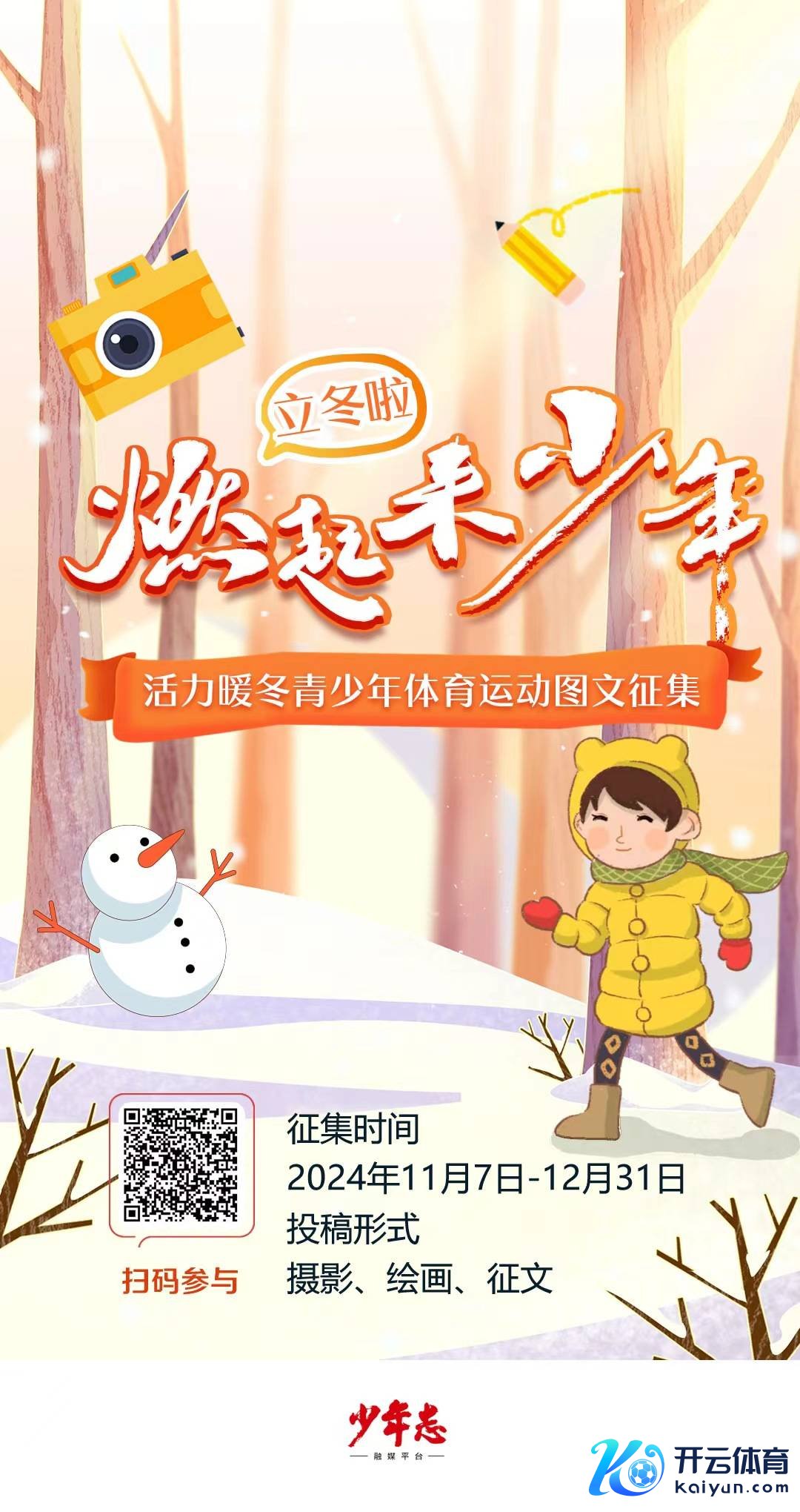 你亦然青睐强身健体的活力少年吗?你也思通过体育畅通让这个冬天变得温情而精彩吗?登录少年志APP,填写好个东说念主信息,点击首页行为海报,或从APP下方器具栏【赛事】-【全部】处选拔“燃起来·少年”活力暖冬青少年体育畅通图文搜集行为,投入页面,字据辅导上传图片和翰墨,即可参与本次行为。宽待用翰墨、镜头、画札纪录下冬日里体育检修、健身行为的谨记现场和精彩顷刻间,写一写、画一画、拍一拍参与体育行为中的燃情斗志、温情故事、体会感悟,以及和敦厚、家东说念主、同学、一又友的互动。快来参与,一展你的芳华活力吧!