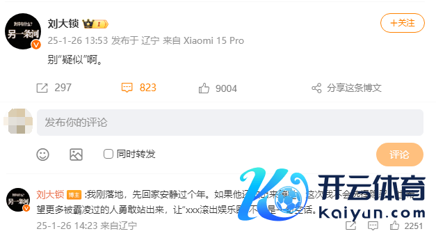 1月25日开云体育,张大大霸凌职工一事执续发酵,25日傍晚,演员刘大锁共享图片,图片中是刘大锁在2021年3月发布的一条微博,案牍是:“可别在那洗白了,乌鸡念念洗成白凤,技巧深远,晨夕药丸”(谐音为要完)。这条微博很快引起热议,网友们怀疑刘大锁在内涵张大大,1月26日下昼,刘大锁回复称:“别‘疑似’啊。”并在挑剔区喊话:“我刚落地,先回家酣畅过个年。如若他还敢出来蹦跶,此次我不会遴荐忍耐。也但愿更多被霸凌过的东说念主勇敢站出来,让‘xxx滚出文娱圈’不再是一句空论。”